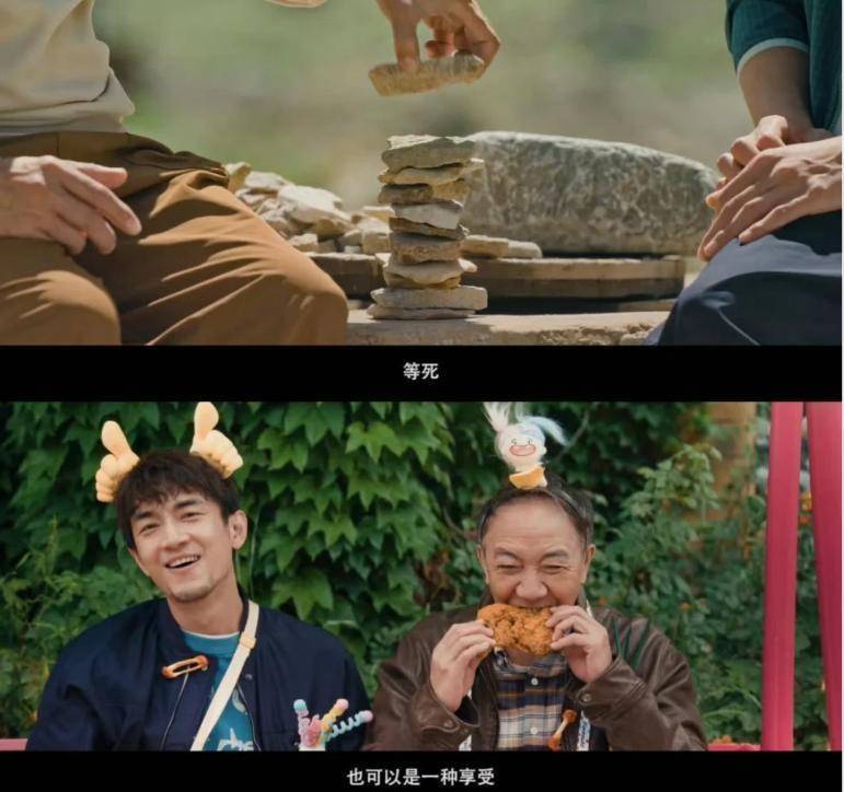 比如,马腾陪着老林去游乐园坐跳楼机,想让他“吓死”,结果自己吓得魂飞魄散,遭到老林吐槽;约着去江边赴死,刚摆好pose,就被广场舞大妈薅去跳《小苹果》,马腾顺拐脸红,老林拄着拐翻白眼,活脱脱一场大型社死现场;还有老林假装喝农药,马腾吐槽“演技太假”后,悄悄把农药换成红糖水。